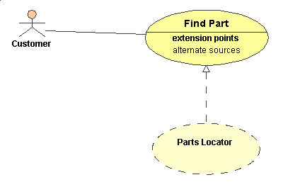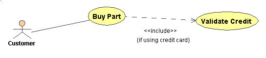 Figure 1 illustrates a typical use of a guard condition in a use case diagram. If the customer is using a credit card the Buy Part use case will include the Validate Credit use case. Guard conditions typically get documented as preconditions within the text of the use case.